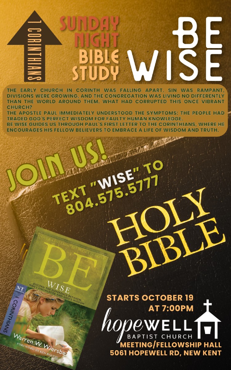 Starts afresh on October 19, 2025 with a study on 1 Corinthians using Warren Wiersbe's commentary, Be Wise. YOU are welcome to join in any Sunday evening.